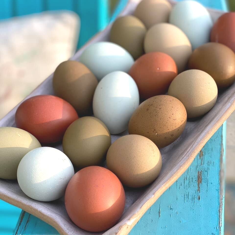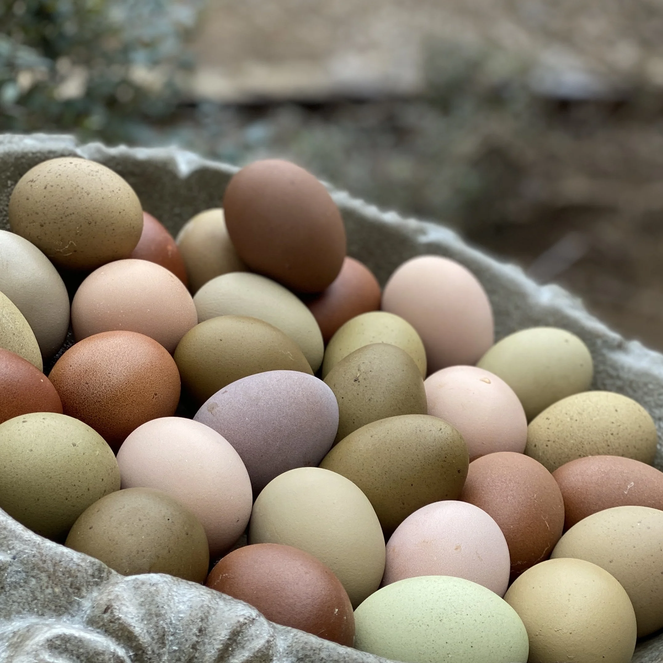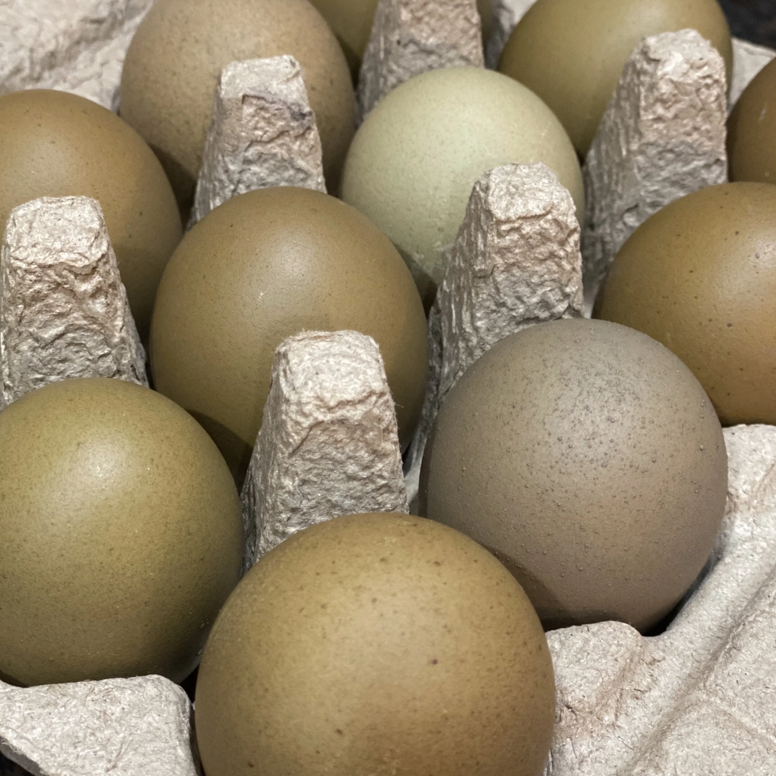 These are not pure breeds. Our hens are multi-generation Olive Eggers, Black Copper Marans, Legbars, Welsummers, Easter Eggers and Ameraucanas. All of our chickens free-range and live a healthy non-confined life.