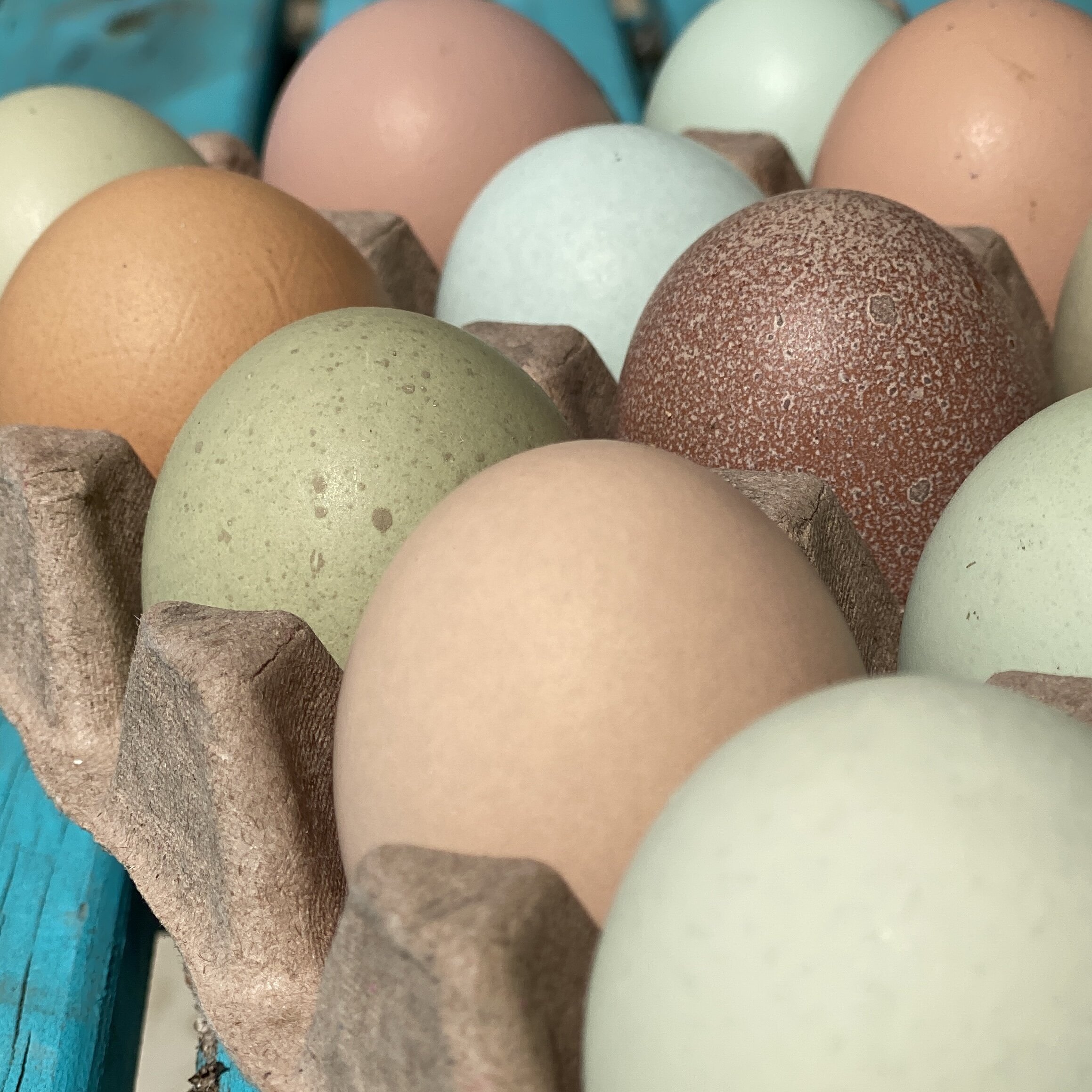 Our hens are covered by Black Copper Marans, White Ameraucanas, Welsummers, Whiting True Blue, and Olive Egger roosters. They will produce colors very similar to these. Some eggs will have a heavy bloom and appear ashy-colored or purplish-grey or pink.